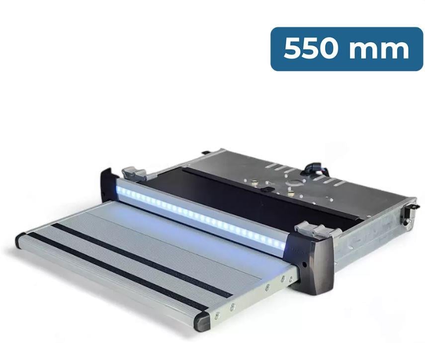 Otomatik açılır LED aydınlatmalı alüminyum basamak – karavan girişlerinde maksimum güvenlik, dayanıklılık ve konfor.