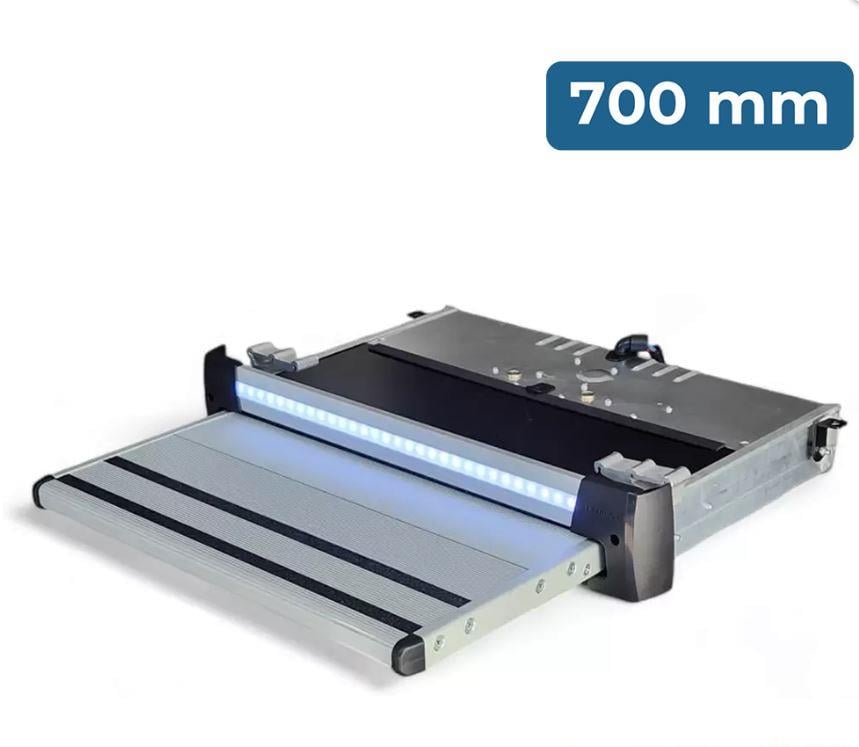Karavan girişlerinde maksimum genişlik, otomatik konfor ve LED güvenliği sunan eloksallı alüminyum basamak.